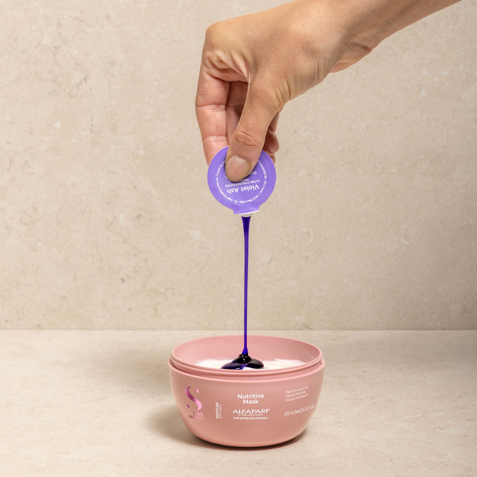 - Per l'uso con la maschera, versare l'intero contenuto della cialda nel prodotto in vaso e mescolare fino a una completa miscelazione del colore.